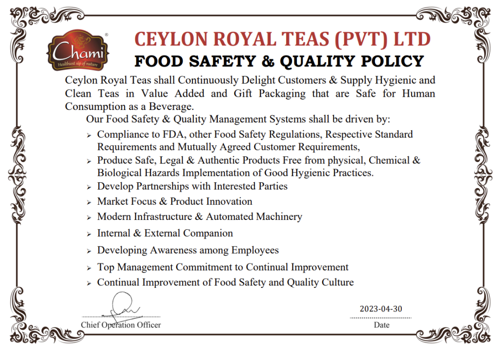 In order to protect the welfare of its employees, Ceylon Royal Tea (Pvt) Ltd complies with the Rainforest Alliance Sustainable Agriculture Standard Supply Chain Requirements, national laws, and international agreements that the nation has ratified, including those of the International Labor Organization (ILO).